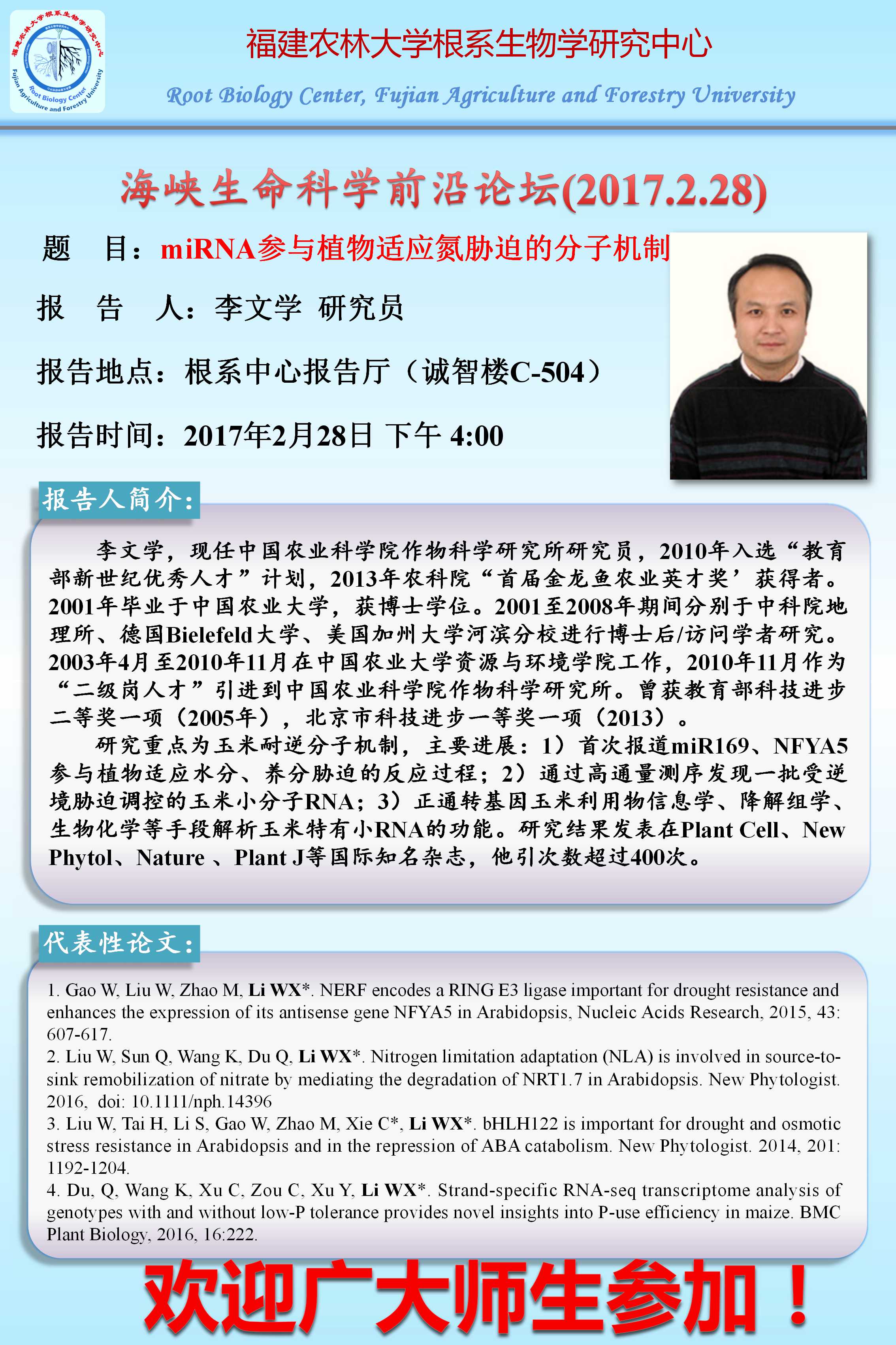 海峡生命科学前沿论坛第五十六讲(2017.2.28)-miRNA参与植物适应氮胁迫的分子机制
