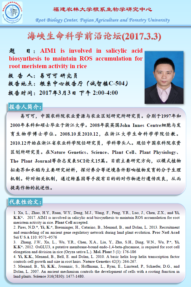 海峡生命科学前沿论坛第五十七讲(2017.3.3)-AIM1 is involved in salicylic acid biosynthesis to maintain ROS accumulation for root meristem activity in rice