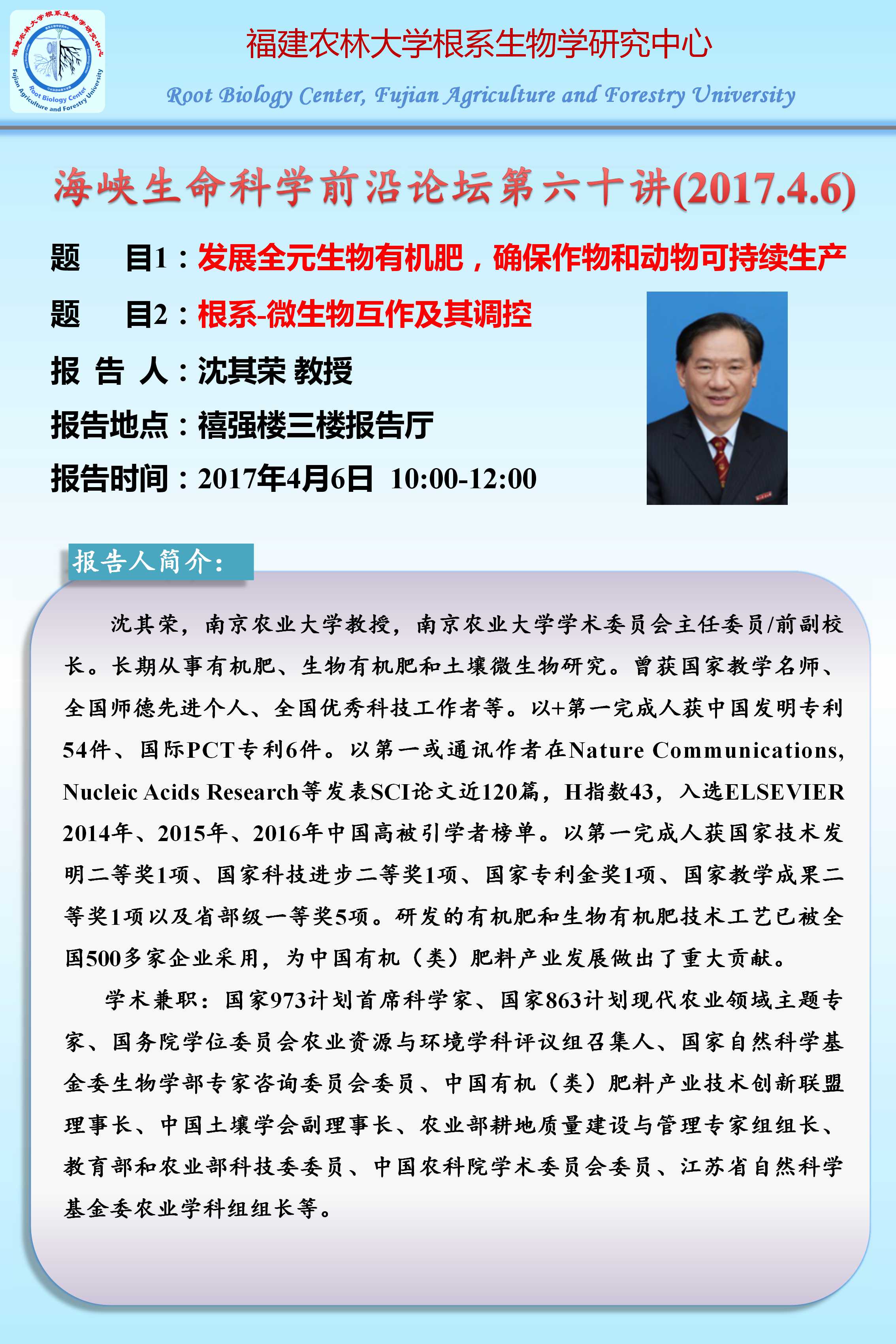 海峡生命科学前沿论坛第六十讲(2017.4.6)-发展全元生物有机肥,确保作物和动物可持续生产等