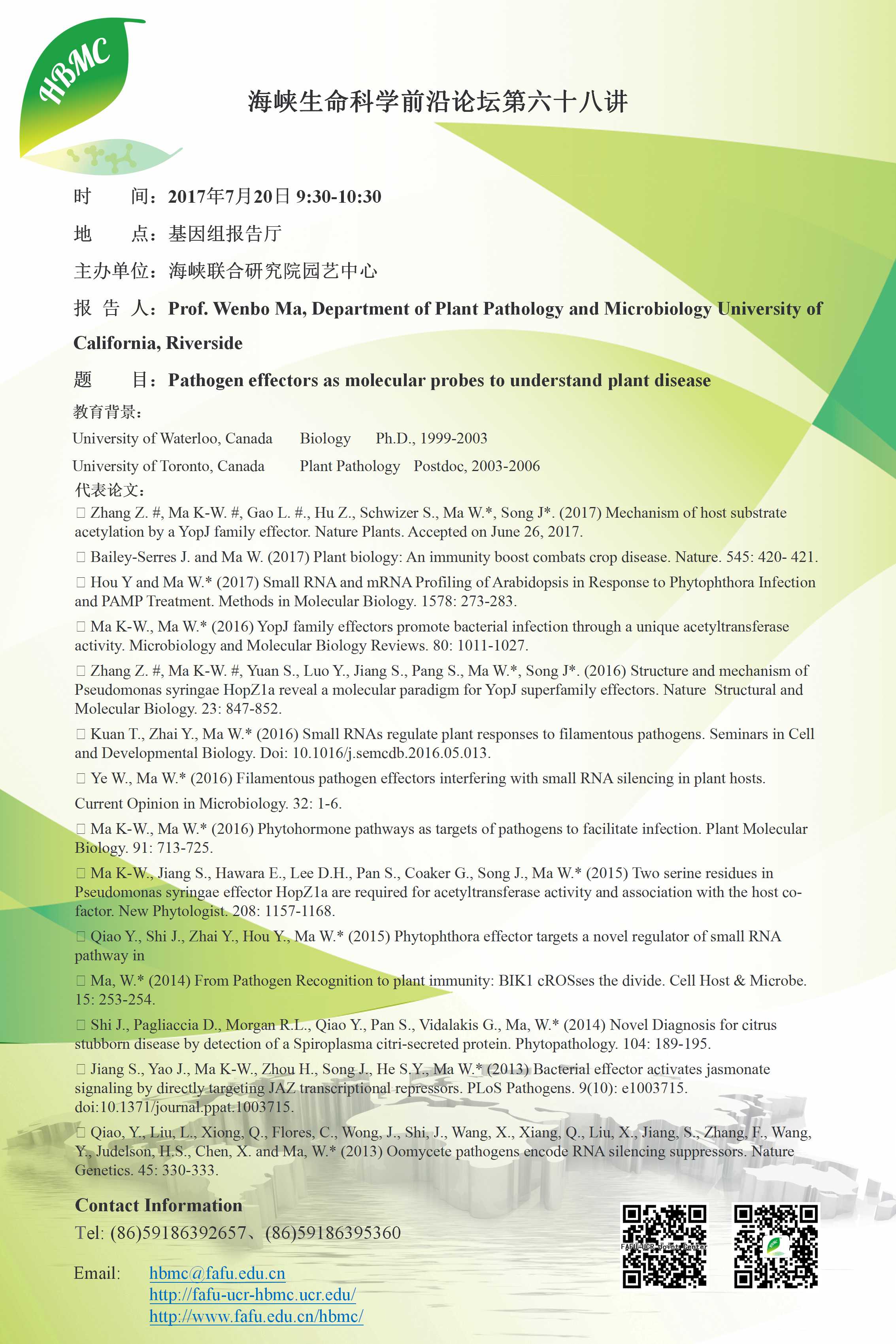 海峡生命科学前沿论坛第六十八讲(2017.7.20)-Pathogen effectors as molecular probes to understand plant disease