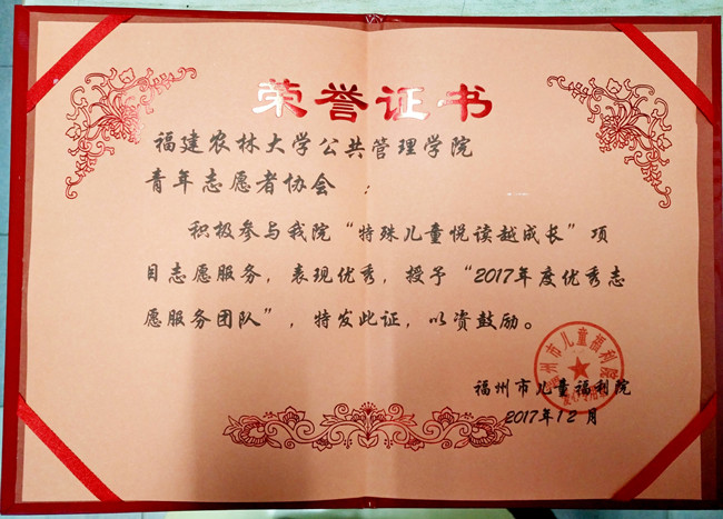 近日,福州市儿童福利院召开志愿者服务工作总结会议,会上对2017年全院志愿服务进行了总结,并表彰了志愿服务优秀的个人及团体。我校公共管理学院青年志愿者协会在2017年度中积极参与福州市儿童福利院的“特殊儿童悦读越成长”项目志愿服务,荣获“2017年度优秀志愿者服务团队”称号。