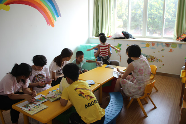 挑几本书,志愿者们满怀深情开始爱心陪读之旅。“青蛙弗洛格走过去,和他的朋友们一起快乐的玩耍......”看似童稚的书籍,却是这些孩子们思想遨游的乐园,当他们接触到这些绘本时,他们的眼中闪烁的是好奇懵懂而又充满朝气的目光。从他们欢乐的鼓掌和爽朗的笑声中,志愿者们深深感受到了他们的快乐。