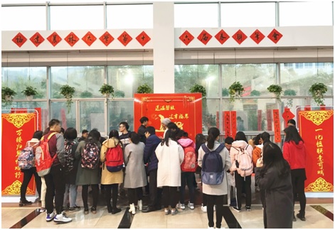 活动现场墨香四溢,气氛热烈,到处都洋溢着喜气亮丽的“中国红”。隶书,篆书,楷书,行书,草书等字体抒发着新春的祝福跃然纸上。到场的师生们也饶有兴致地体验书写对联,感受楹联文化对仗工整的文字格律之美。一副副喜庆吉祥的春联,一行行俊逸灵秀的书法,饱含着浓浓的墨香情谊,7个小时共送出春联、福字近600幅。