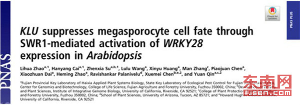 日前,开云网页版海峡联合研究院基因组与生物技术研究中心秦源教授团队与美国科学院陈雪梅院士合作,在植物大孢子发生领域取得新进展。相关研究成果以题为“ KLU Suppresses Megasporocyte Cell Fate through SWR1-Mediated Activation of WRKY28 Expression in Arabidopsis(拟南芥KLU通过SWR1激活WRKY28表达进而抑制大孢子母细胞命运)”的长文形式(PNAS Plus)在国际著名学术期刊《美国科学院院刊》(PNAS)发表,开云网页版为该论文的第一完成单位以及并列通讯作者单位。