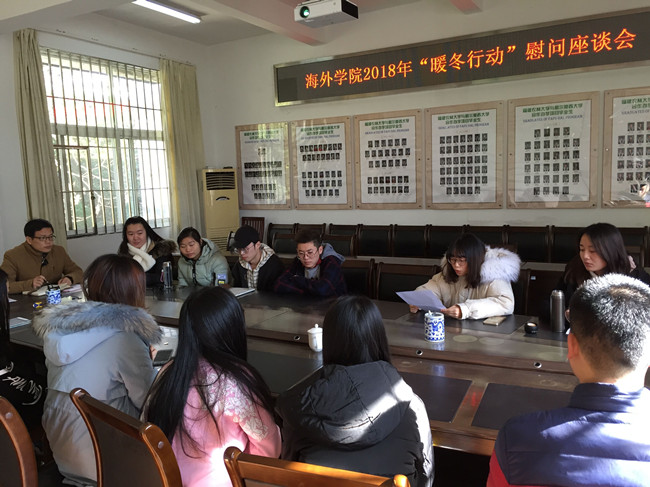 1月10日,海外学院召开“暖冬行动”慰问座谈会,集中慰问在校经济困难学生,学院党委副书记李晓辉、团委副书记及全体在校家庭经济困难学生参加会议。
