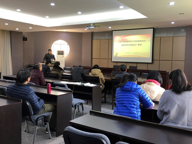 会上,曹仁稳深入浅出的介绍了《意见》出台的背景和意义、依据、高校教师党支部的定位、建设目标以及加强高校教师党支部建设的重点任务等,并不时结合学校出台的《中共开云网页版委员会严格执行党内组织生活暂行规定》、《关于推进“两学一做”学习教育常态化制度化的实施方案》中规定的细节进行讲解。与会人纷纷表示获益良多,在今后工作中将以十九大精神为指引,切实把思想和行动统一到党的十九大精神上来,坚持知行合一,真抓实干。