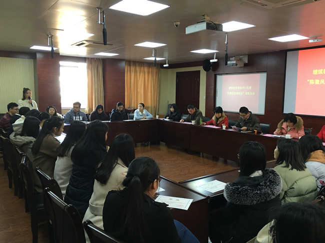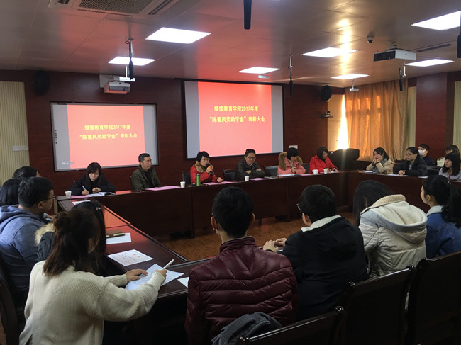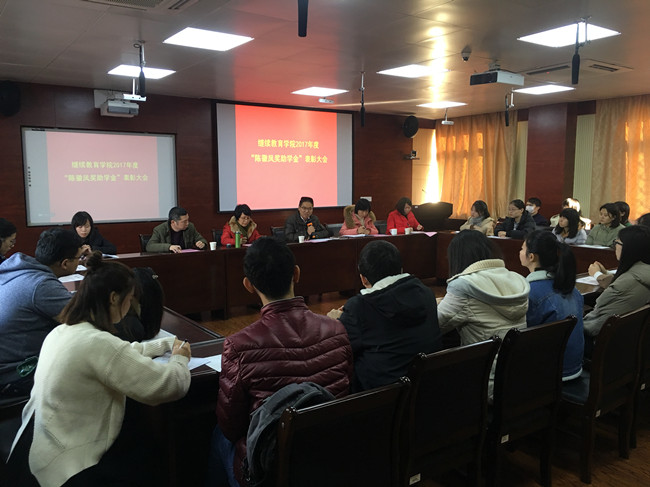 1月11日下午,继续教育学院在学院五楼多媒体教室召开2017年度“陈徽凤奖助学金”表彰大会,学院党委书记苏健涵、院长李秀慧、副院长林志鹏、自考办主任林玉英、自考办张锦珍老师及全体获奖同学出席了会议。会议由学院党委副书记林素文主持。