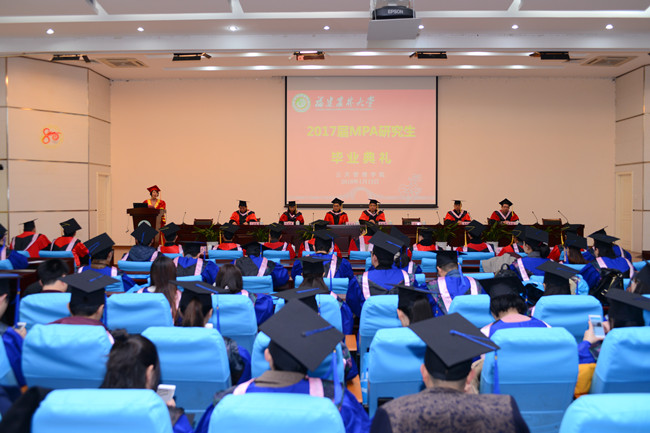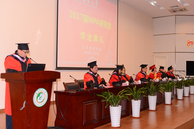 1月13日上午,公共管理学院2017届MPA研究生毕业典礼在禧强楼学术报告厅举行。院党政领导、MPA研究生校内外导师、毕业生及其部分家属出席毕业典礼。副院长苏时鹏主持典礼。