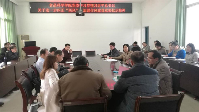 食品科学学院与会人员认真学习了习近平总书记关于进一步纠正“四风”、加强作风建设重要批示精神。会议要求,学院全体党员同志、特别是为师生员工服务的行政人员,要坚决杜绝“门好进、脸好看”,就是“事难办”;层层重复开会,用会议落实会议或者只有QQ群来传达通知会议精神;办事拖沓敷衍、懒政庸政怠政,把责任往上推的现象。学院领导干部要带头转变作风,身体力行,以上率下,形成“头雁效应”。在接下来召开的民主生活会和组织生活会,要把学习贯彻党的十九大精神,贯彻落实中央八项规定精神、转作风改作风情况作为对照检查的重要内容,切实按照习近平总书记的重要指示要求,认真查找“四风”突出问题特别是形式主义、官僚主义的新表现,采取过硬措施,坚决加以整改,务求取得实效。