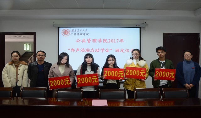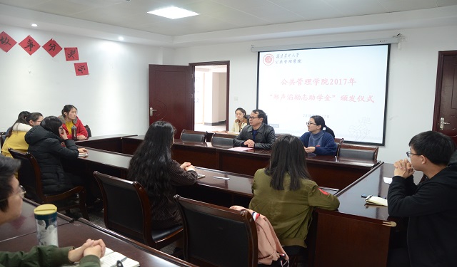 1月17日,公共管理学院于公管楼205召开2017年“郑声滔励志助学金”颁发仪式。参加本次会议的有学院党委副书记陈建辉、辅导员及全体励志助学金获得者。