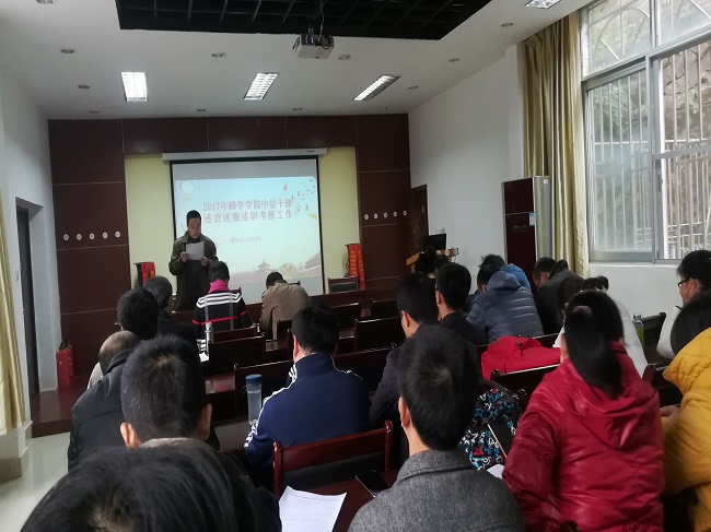 1月19日上午,蜂学学院召开2017年度中层干部述责述廉和述职考核工作会议,校党委组织部干部科科长莅会指导,学院全体教职员工参加会议,会议由学院党委书记张开晃主持。