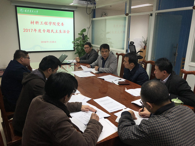 按照省委纪委、组织部和校党委的安排部署,1月25日上午,材料工程学院党委以“认真学习领会习近平新时代中国特色社会主义思想,坚定维护以习近平同志为核心的党中央权威和集中统一领导,全面贯彻落实党的十九大各项决策部署。”为主题,在旗山校区综合楼四层会议室召开2017年度专题民主生活会。校第二督导组副组长、校党委办公室(校办公室)副主任沈锐强及校保卫处(人民武装部)办公室主任黄锦湖到会督导工作。会议由学院党委书记陈建辉主持。