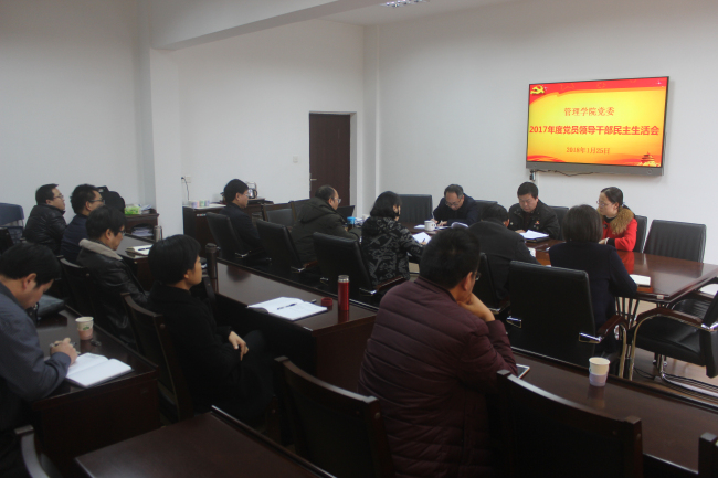1月25日下午,管理学院党委召开2017年度党员领导干部民主生活会,以“认真学习领会习近平新时代中国特色社会主义思想,坚定维护以习近平同志为核心的党中央权威和集中统一领导,全面贯彻落实党的十九大各项决策部署”为主题,对照党章,对照《中共中央政治局关于加强和维护党中央集中统一领导的若干规定》《中共中央政治局贯彻落实中央八项规定实施细则》精神,对照初心和使命,结合思想和工作实际,深入查摆问题,深刻剖析原因,严肃开展批评与自我批评。学院党委书记谢志鸣主持会议,校第2督导组副组长刘鸿莅会指导,学院领导班子成员参加了会议,党委委员、科级干部、系正副主任、工会主席、校第三次党代会代表列席了会议。