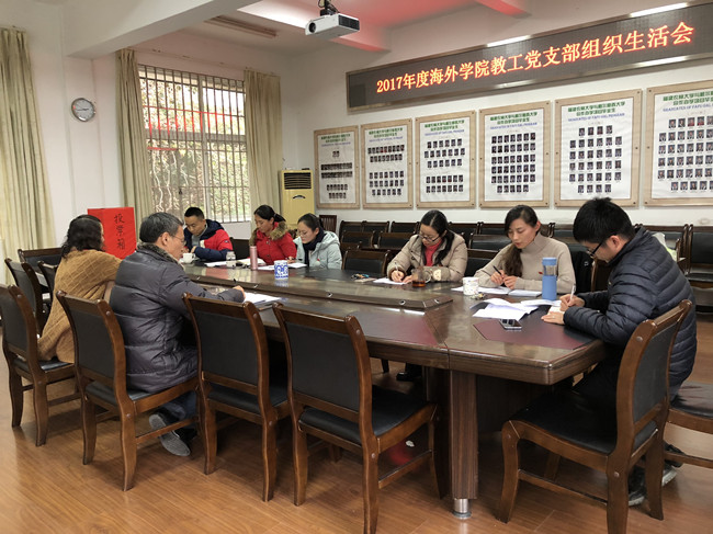 1月29日下午,2017年度海外学院教工党支部组织生活会在学院305会议室召开,深入开展批评与自我批评及民主评议党员,支部全体党员参会,两名处级党员领导干部以普通党员身份参加会议,党支部书记主持会议。