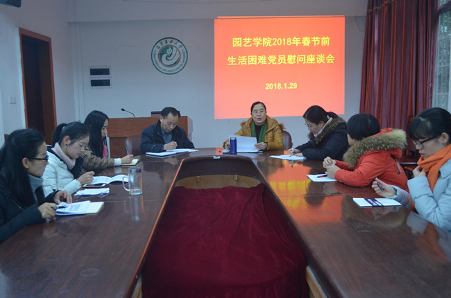 1月29日下午,园艺学院党委在园艺楼一楼会议室召开学生困难党员2018年春节前慰问座谈会。学院党委书记张华英、党委副书记张文元及学生困难党员代表出席会议,会议由张华英主持。