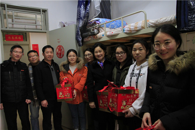 在传统节日春节即将来临之际,2月5日下午,校党委书记叶辉玲、校党委副书记曾华平一行来到北区5#121女生宿舍及北区2#323男生宿舍看望慰问寒假留校学生,为他们送去学校的关怀和新春的祝福,希望他们珍惜大学时光,立足长远,打好知识基础,合理安排时间,在学校度过一个有意义的春节;提醒他们要注意安全,相互照顾,遇到困难要及时联系值班老师;嘱咐他们要及时向家人打电话报平安,并请他们代为向家人转达学校的新春祝福。同时,要求相关部门全力做好后勤保障服务,让留校师生度过一个欢乐祥和的春节。