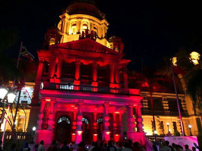 当地时间2018年2月9日晚,由广州市政府发起,德班理工大学孔子学院和德班-广州友好城市协会联合承办的非洲大陆首个“全球高塔亮灯活动”在南非德班市政厅隆重举行。中国驻南非德班总领馆总领事王建州、副总领事丁巧,德班市副市长法齐娅·皮尔(Fawzia Peer),德班理工大学孔子学院院长吴林,德班—广州友好城市协会会长李敬民以及各界新闻媒体记者出席了此次亮灯仪式。