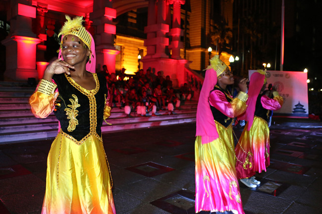 鼓声刚落,便响起了中国风舞曲。来自德班理工大学孔子学院的学员为大家带来了中国传统民族舞表演,舞步轻盈优美,律动轻快活泼,演绎出了不一样的中国味道,送出了不一样的南非祝福,让南非人民在欢乐祥和的中国春节氛围中加深了解中国传统节日文化。