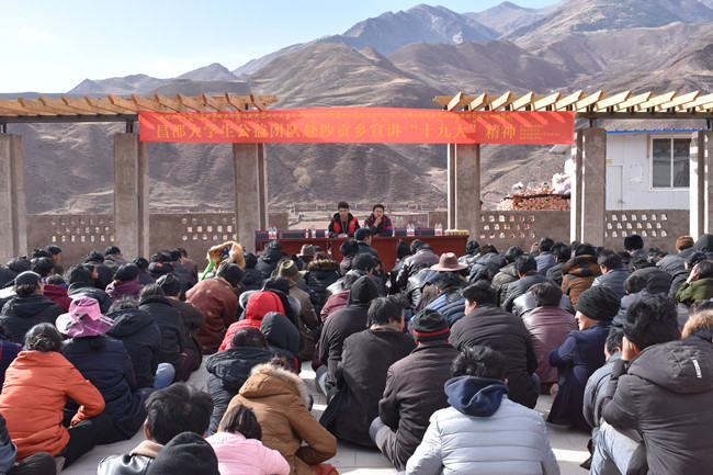 在西藏昌都市卡若区沙贡乡达东村,为更好地宣传十九大精神,实践队员走村入户进行问卷调查,进一步了解农村、农民,为长期实践垫定基础。累计走访农户二十余户,完成问卷27份。在当地政府的支持和帮助下,实践团队在达东村开展了十九大精神宣讲会,队长斯郎旺修担任主讲,参加宣讲会的有达东村基层干部和当地村民五百多人。实践团队重点宣讲了党的十九大关于坚决打赢脱贫攻坚战的相关精神,将十九大精神用青年的语言、生动的故事传达给基层干部群众。除了十九大精神宣讲,实践队员还发挥不怕苦,不怕累的精神,与当地部分村民一起动手捡拾垃圾,打扫村道,为整洁村容村貌奉献一份力量。