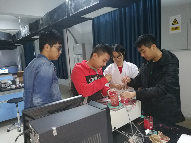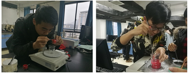 活动当天,班长陈奇有组织班级男生来到旗山校区庄启程楼A501实验室,在陈翠霞老师的指导下,熟练运用烧杯,水浴锅等实验设备,精心制作了十余种色号的口红。