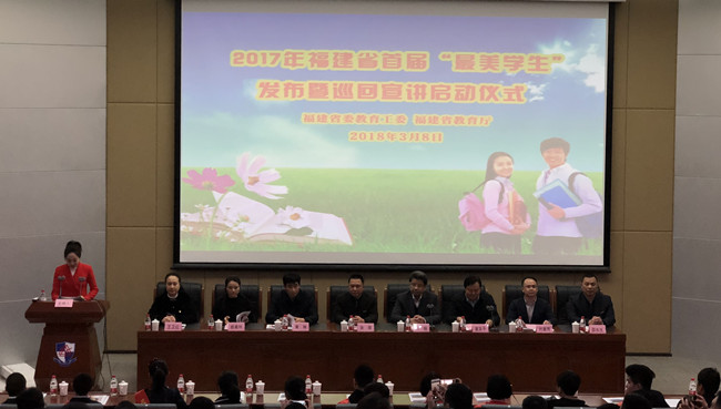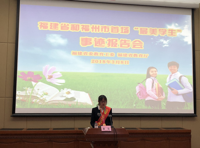 3月8日下午,省委教育工委、省教育厅在福州第三中学举行2017年福建省首届“最美学生”发布暨巡回宣讲启动仪式。省、市教育部门领导,“最美学生”代表、师生代表和省、市新闻媒体记者共计300余人参加启动仪式。启动仪式上,发布了福建省首届“最美学生”名单,向部分“最美学生”代表颁发了荣誉证书、奖章和奖金。我校经济学院2014级金融学专业童玺同学作为“最美学生”代表参加仪式并作宣讲报告。