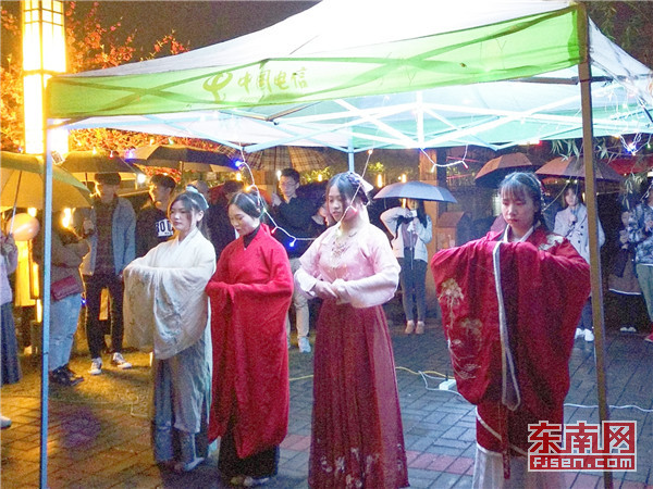 活动伊始,一曲古筝婉转悠扬,来自2016级行政管理专业的肖婷轻举茶具表演茶艺,柔美的姿态让在场同学们拍手叫好;身穿汉服的女生带来走秀表演,她们姿态端庄,步履悠扬;校十佳歌手2015级统计学专业郭捷、2015级电子信息工程专业兰子洋、2015级动物科学专业郑定黔演唱动人的歌曲,现场气氛时而欢快、时而动情,观众沉浸其中。“现场灯光很漂亮,表演也很好看,我印象最深刻的是走秀的同学们,她们穿的都很单薄,在淋雨的情况下还是坚持走完了,很佩服她们的精神。”来自该校2016级电气工程及其自动化的邱志宪表示。