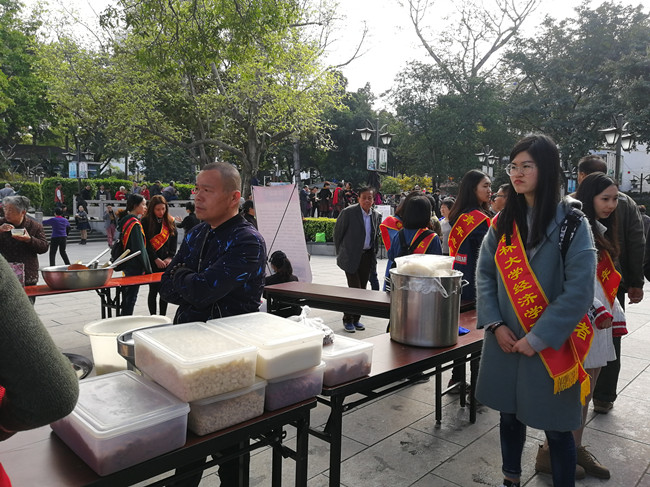3月14日上午,经济学院青年志愿者协会10名志愿者前往西湖公园晨曦广场志愿服务鼓西街道西湖社区举办拗九节免费送粥活动。