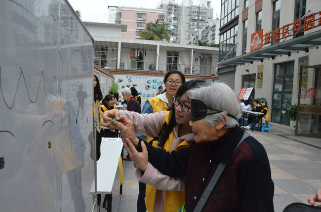 志愿者们经过简单的游园活动培训,便迅速开展此次志愿活动,并有序分配了任务,布置好游园会场地。本次志愿活动吸引了许多辖区居民参与,在游戏体验区中有蒙眼贴鼻活动,志愿者帮居民戴好眼罩,对参与的居民进行指路,帮助参与者准确贴好“鼻子”。在便民服务区,血压血糖问诊的检查吸引了不少较大年纪居民的兴趣,“爷爷,您坐着等一会,下一个就到您啦。”志愿者将一位70多岁的老爷爷搀扶到椅子上等待时这么说道。整个游园活动从下午两点半持续到五点结束,志愿者们认真的工作态度也得到了服务中心工作人员的一致好评。