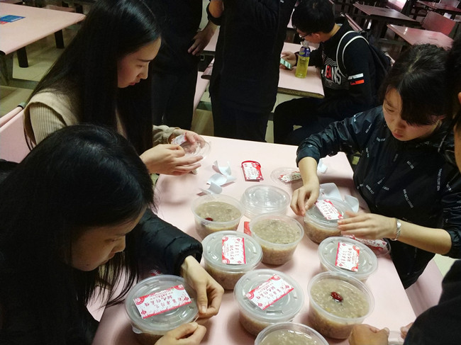 清晨,志愿者们挑选好红枣、龙眼等食材,认真洗净、剥壳,再加上浸泡好的糯米,用旺火蒸煮几分钟,待糯米开始呈现黏性时,再放入一定数量的红糖板,轻轻搅拌,一碗拗九粥便做成了。志愿者们用盒子精心包装,贴上“百善孝为先,拗九传真情”的标语,送往学校老教师的住处,与老教师们聊聊天,话话家常,打扫卫生,其乐融融。“看着老师们品尝着热腾腾的拗九粥,脸上洋溢的笑容,觉得自己心里也是暖暖的。”参与此次活动的袁同学说。“拗九粥的味道一直都是这个味,让人心甜”,对于志愿者们的到来,老教师们都非常感动。