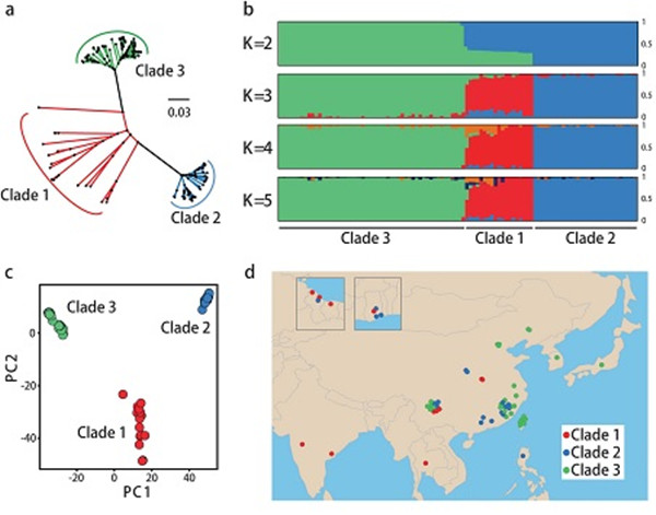稻瘟病菌田间群体聚类分析。a,基于SNP的田间菌株进化树;b,田间菌株的结构分析;c,田间菌株的主成分分析;d,田间菌株的地理位置。