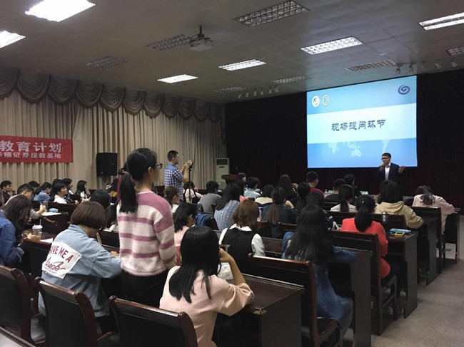 随后,王宁为大家介绍了华福证券及其投教基地的相关活动,以其多元化、趣味性、实用性的特质,引导、鼓励同学们自主学习投资知识。翁滨松为大家讲解了证券基础知识和模拟炒股大赛相关内容。他就证券含义、股票交易规则、如何看股市行情、如何寻找目标股四个方面,阐述了自己的意见和建议,丰富同学们的证券基础知识,并详细解说了本次模拟炒股大赛的注意事项。在观众提问环节,翁老师用生动、专业的讲解解答了大家的困惑,并希望同学们在本届的经济文化节中能有所收获,以激昂的斗志和创新的理念去了解金融知识、关注金融市场,不断提升自己。