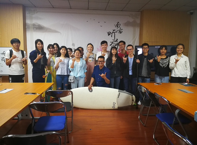 沙龙嘉宾吴迪以亲身接触桨板冲浪的实例为同学们讲述这项新颖的水上运动,同时向同学们传授如何使用信息化数据预知潮汐与洋流,如何观察判断危险的离岸流,以及水上安全标志识别、防溺水知识、落水应急措施、实用的水上自救逃生知识等。在互动环节中,嘉宾带来了冲浪板以及陆地桨板进行现场体验,同学们被沙龙活动丰富的形式以及知识性、趣味性深深吸引。
