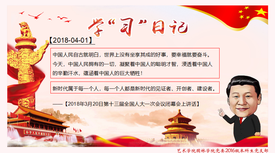 深入学习宣传贯彻党的十九大精神,是当前和今后一个时期全党全国的首要政治任务。近日,艺术学院园林学院2016级本科生党支部开设《学“习”日记》平台,通过支部群每日推送同学们喜闻乐见的激励语录、十九大精神、党史、时事政治等,同时开展系列主题鲜明的互动、知识竞赛等活动,帮助支部党员学习贯彻、学懂弄通党的十九大精神。