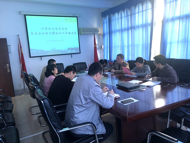 4月10日上午,计算机与信息学院在行政三楼会议室召开学生安全稳定暨就业工作推进会,传达学校以及上级有关通知精神,安排部署校园安全稳定工作及学院2018届毕业生就业推进工作,学院党委副书记吴鹏程和全体辅导员参加会议。