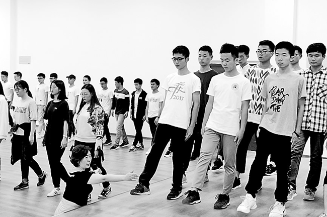 接下来,几个小时练习走路,怎么抬腿,如何落步,就像慢镜头一样不断重复。大家喊着号子,一丝不苟地按照老师的要求完成每一个动作。