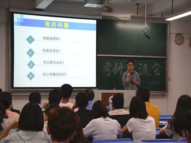 交流会中,老师们介绍了各专业考研的基本情况,为同学们详细解答了考研政策、复习策略、复试技巧等方面的问题。各专业优秀学生代表也分享了各自的考研心路历程和注意事项,并建议同学们应明确定位,积极投入,认真备考,要及时调整状态,科学制定复习计划,提高学习效率。随后在互动环节中,同学们积极请教提问,老师进行了详细解答,帮助学生更加清晰地了解考研升学的前景,坚定目标和信心,为2019年考研准备指明了方向。