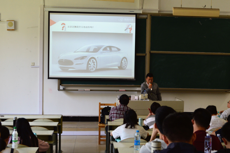 讲座伊始,洪秋鑫便介绍了纯电动汽车的主要结构,并以清晰的图片和简洁明了的文字说明让同学们从形体上认识了纯电动汽车。接下来,洪秋鑫针对电动汽车在使用过程中的注意事项以及保养维护的要点进行详细的介绍。讲座内容涉及到了电动汽车的方方面面,极大程度的扩充了同学们对新能源汽车的认识,为同学们生动有趣地普及了纯电动汽车的发展现状、技术难点、发展趋势等基本知识。