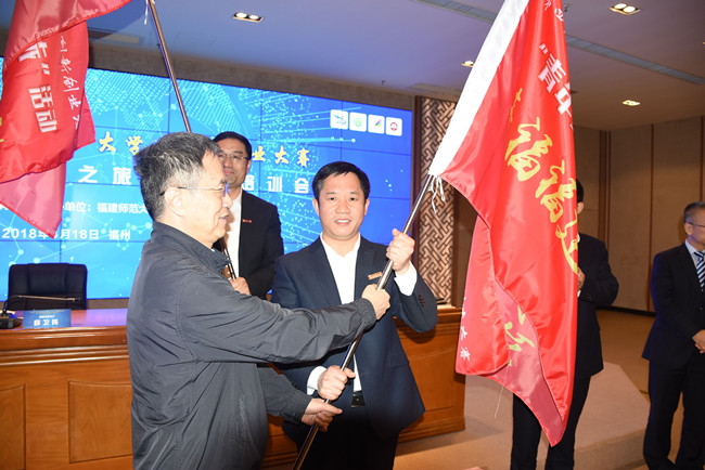 4月18日下午,第四届福建省“互联网+”大学生创新创业大赛暨“青年红色筑梦之旅”活动培训会在福建师范大学举行。会上,全国政协常委、省政协副主席、教育厅副厅长薛卫民向我校授予“幸福福建小分队”旗帜,校党委副书记曾华平代表学校参加授旗仪式。