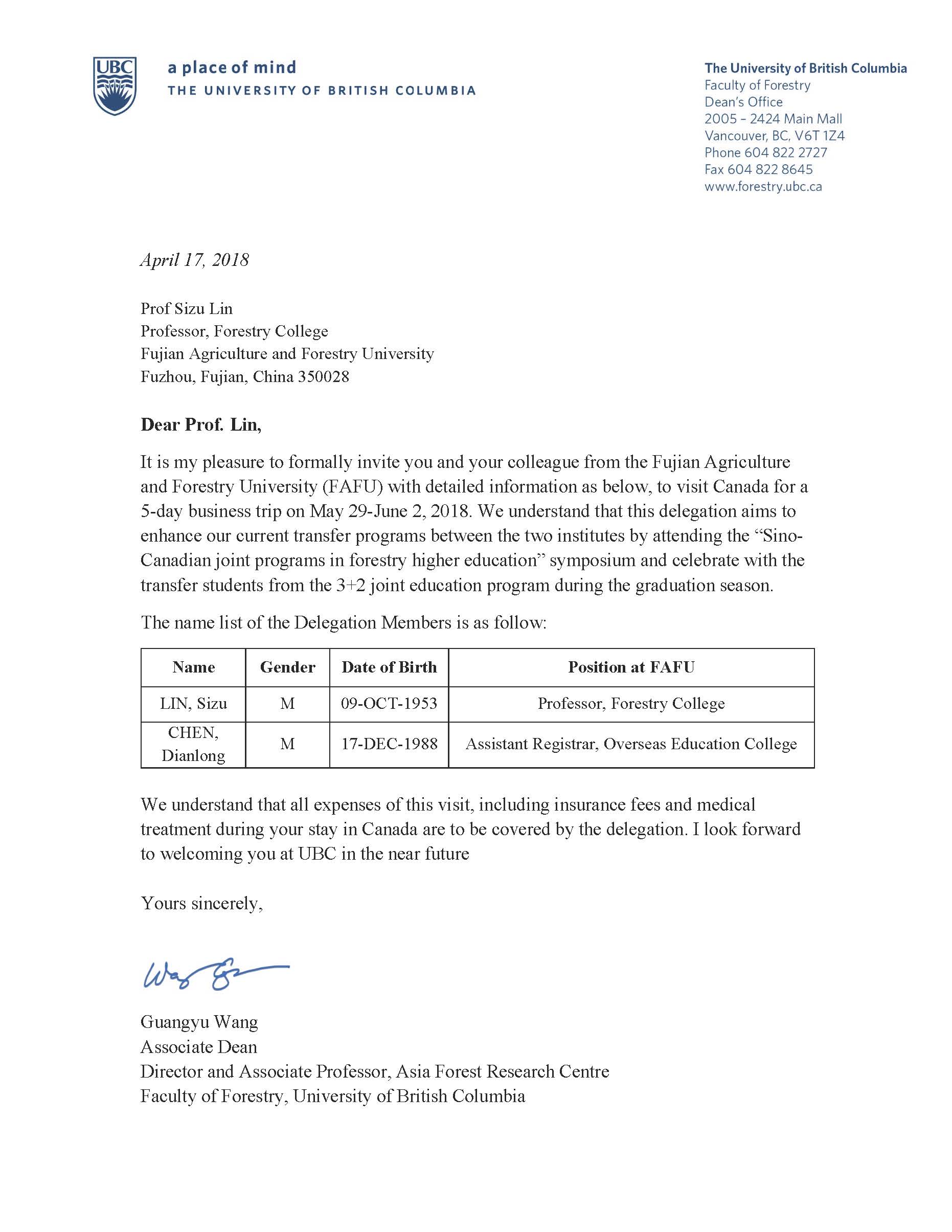 出访任务 | 赴加拿大不列颠哥伦比亚大学参加合作办学项目管理层会议与中加合作办学项目(林业高等教育)大会,并出席2018年我校海外留学生在不列颠哥伦比亚大学的毕业典礼。 | |||
