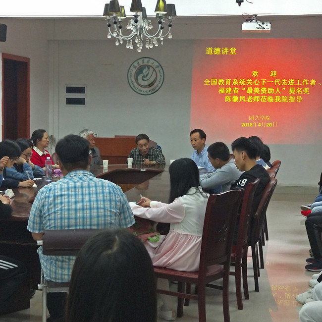4月20日下午,园艺学院在院办会议室举办“道德讲坛”先进人物事迹分享会,邀请了全国教育系统关心下一代先进工作者、福建省“最美资助人”提名奖、校继续教育学院关工委副主任陈徽凤老师主讲;院党委副书记张文元,团委书记陈萍,离退休党委第五党支部书记王家福及支部委员,学生代表共计35人参加了分享会。