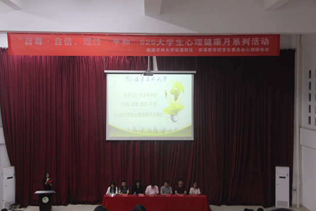 4月24日,安溪校区·安溪茶学院第四届“自尊·自信,理性·平和”主题的大学生心理健康月开幕式在创新报告厅召开。安溪校区·安溪茶学院党委副书记黄成茂、党委秘书兼学工部部长纪文元、校区心理健康指导中心钟琳老师、外聘心理咨询师李丽娜老师、校区全体政工以及校区学生代表300余人参加了此次开幕式。本次活动由安溪校区·安溪茶学院团委主办,安溪校区·安溪茶学院学生委员会心理辅导部承办。
