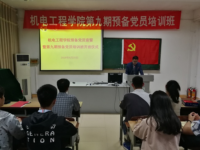 4月25日晚,机电工程学院第九期预备党员培训班在机电楼208正式开班,共有94位预备党员参加本期培训班的学习。学院党委书记陈辉、党委副书记李健英出席开班仪式。开班仪式由院党委秘书主持。