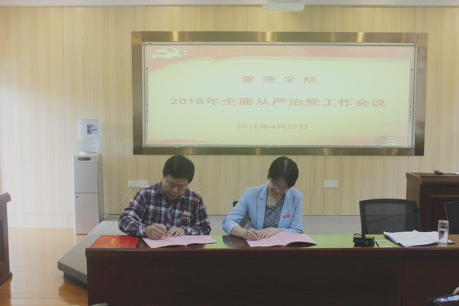 王小榕宣读了《管理学院党委下属党支部落实全面从严治党责任书》,会计系教工党支部、人力资源管理系学生党支部和会计学专业硕士党支部作为党支部代表与学院党委签订了落实全面从严治党责任书。