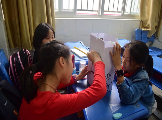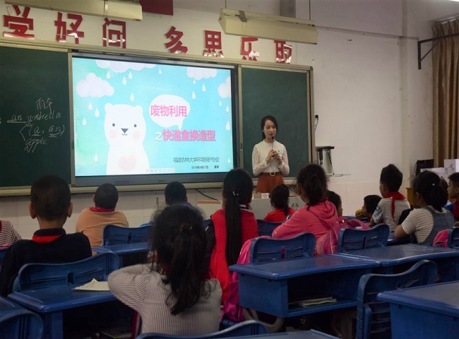活动安排每班一位主讲人兼四位助教,课上先由主讲人讲解废旧品再利用的相关知识,启发同学们发挥想象力对废旧纸盒进行改造,制成可供观赏的艺术品。在随后的动手操作环节中,助教们配合主讲人维持课上秩序,协助小朋友完成对盒子的加工创作。课上同学们认真听讲,积极参与,在对盒子加工的过程中也颇有自己的独特想法,本次环保教育课在轻松愉快的气氛中圆满结束。