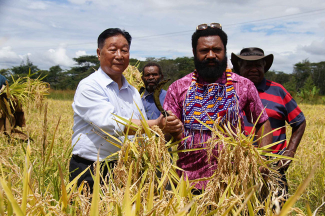 我国驻巴布亚新几内亚全权特命薛冰大使(左三)、巴新农牧业部部长艾伦(左二)和东高地省省长彼得奴姆(右二)收割旱稻金山一号