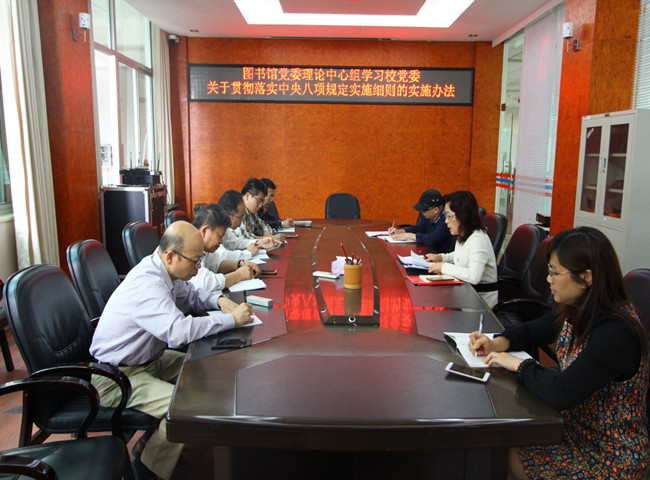 4月28日下午,图书馆党委在逸夫图书馆四楼会议室召开理论中心组专题学习会议,学习《中共开云网页版委员会关于贯彻落实中央八项规定实施细则的实施办法》(以下简称《实施办法》)等文件精神。图书馆党委书记郑美玉主持会议,党委理论中心组成员、图书馆办公室主任参会。