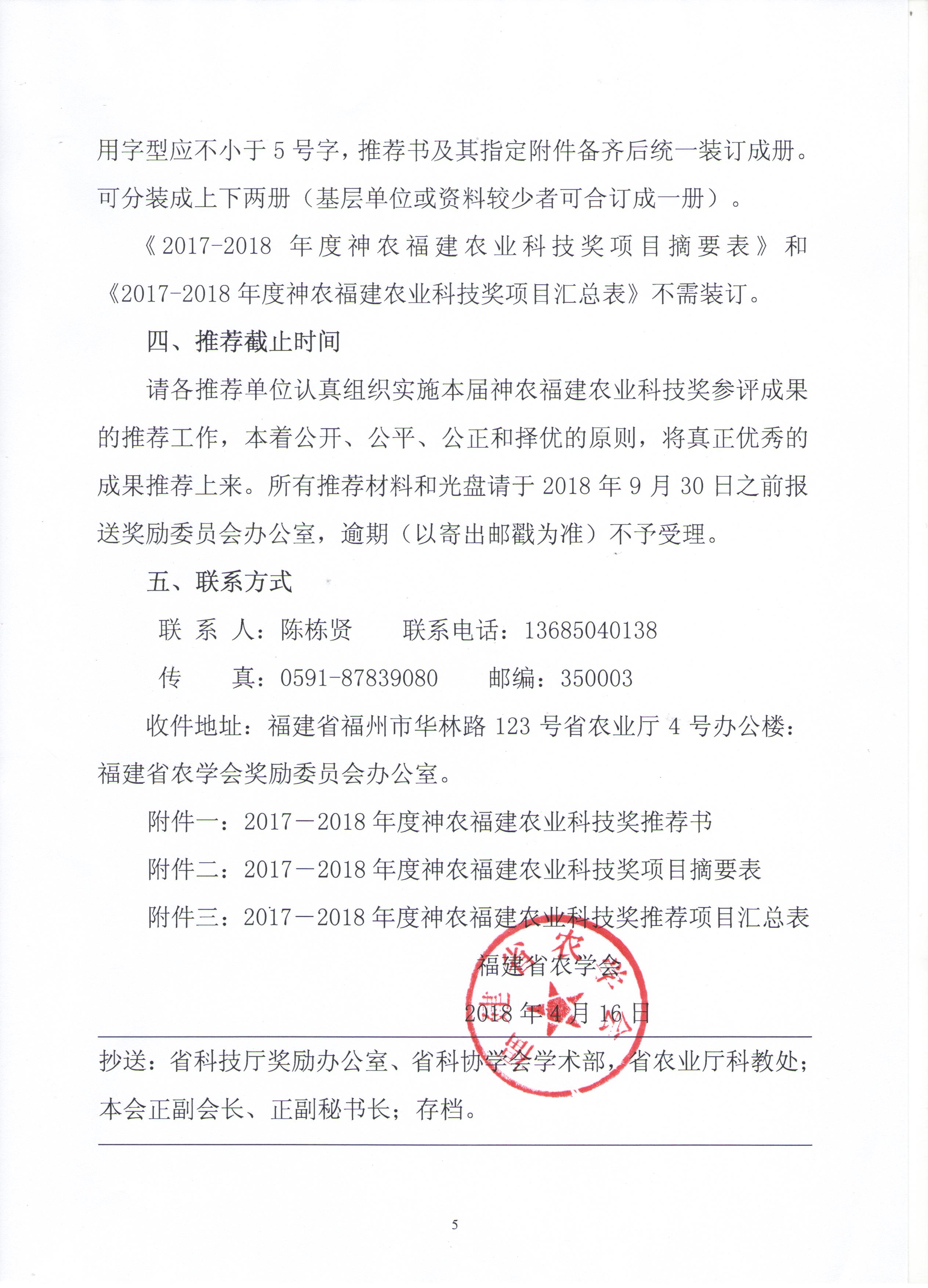 接省农学会《关于开展2017-2018年度神农福建农业科技奖申报推荐工作的通知》(闽农学字【2018】6号),2017-2018年度神农科技奖推荐申报工作已开始,请各学院、中心积极组织好本单位的申报工作。申报截止时间:2018年9月17日;申报材料要求:推荐书及附件材料装订成册一式三份(含原件一份),摘要表一式二十份,含材料光盘一份。联系电话:83789230,联系人:蔡丽娟。