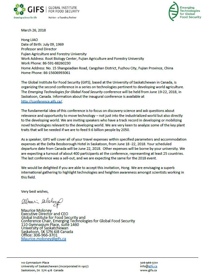 日程安排 | 6.18从广州飞往萨斯卡通;抵达,入住酒店。 6.19 参加全球粮食安全新兴技术会议。 6.20参加全球粮食安全新兴技术会议。 6.21参加全球粮食安全新兴技术会议。 6.22-23 从萨斯卡通返回广州。23日抵达中国。 | |||