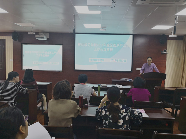 5月3日上午,继续教育学院召开会议,传达学习学校2018年全面从严治党工作会议精神,学院全体教职工参加会议,会议由学院党委书记苏健涵主持。