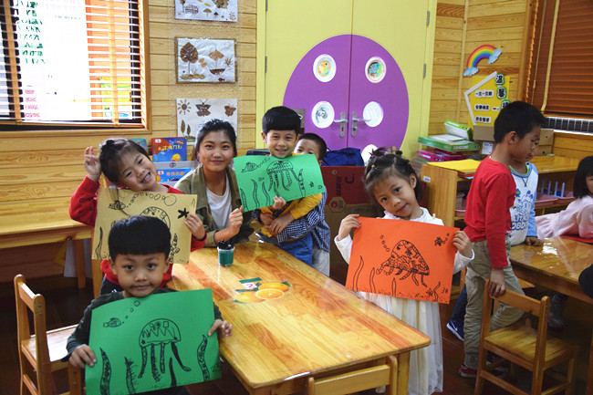 经过之前数次支教活动,志愿者刚踏进教室便受到了小朋友们热情的欢迎。本次教学的主题是画“水母”,孩子们对这种海洋生物充满了好奇,不但认真听老师的介绍,同时也争相举手提出自己对于水母的疑问。在分组教学环节中,每个志愿者指导一组学生,帮助他们更好地完成自己的作品。在展示环节中,小朋友们大方展示自己的作品,体现了天马行空的想象力与无穷无尽的创造力。